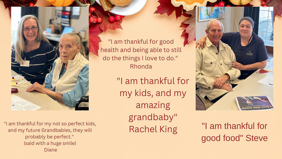 In the spirit of Thanksgiving, I really wanted to reflect and look at life, our company, our friends and our families and as I did so, I recognize there are so many things to be thankful for. Even in the toughest times that we have endured the last few years, there is still so many things to be grateful for. While I am always thankful for our staff's hard work and our residents and families kindness to our staff, some of our staff and residents had some special things to say about what they were thankful for this year. I even got the huge blessing of being able to see Margaret's sneak peak of her holiday spirit as her family was here decorating her room and putting up her holiday tree.